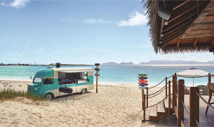 One of Cap Juluca’s new excursions involves setting off in the property’s sea blue vintage Volkswagen van to explore the island’s 33 beaches. Guided by one of the resort’s hosts, no detail is overlooked for a perfect beach day, outfitted with beach chairs, towels, a stocked drink cooler, and a Polaroid camera to capture candid shots from the day. A gourmet picnic lunch will be set up filled with à la carte menu items such as a smoked salmon poke bowl or lobster sandwich. As the sun sets, guests can opt for a champagne toast as they sit back and watch the horizon on the cruise back to Maundays Bay.
